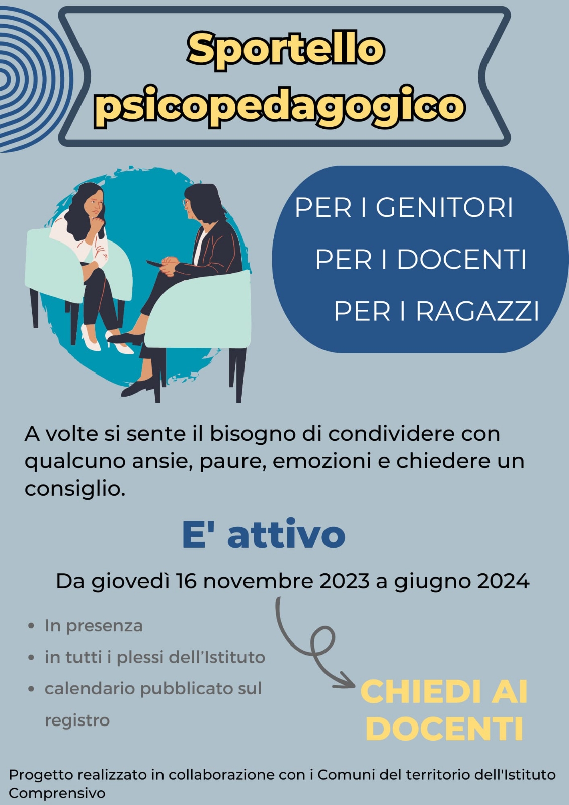 Riapre lo Sportello di Consulenza Pedagogica, servizio che, grazie alla collaborazione degli enti locali, da anni è attivo nel nostro istituto e che rientra nell’ambito del progetto “Prevenzione del disagio e della dispersione scolastica”. La proposta è rivolta ai genitori, ai docenti e agli alunni di scuola secondaria ed ha lo scopo di supportare gli adulti nel compito educativo ed i ragazzi nel percorso di crescita sviluppando un ambiente favorevole all’apprendimento e alla convivenza. Questo anno scolastico, come il precedente, la consulenza sarà fornita dalla Dott.ssa Cristiana De Porcellinis, della cooperativa sociale UNISON di Gallarate. In particolare lo sportello di Consulenza Pedagogica offre ai genitori l’occasione per confrontarsi sulle problematiche legate alle diverse fasi di crescita dei figli, aiutandoli nell’affrontare gli impegni scolastici o situazioni relazionali difficili e, al tempo stesso, ricevendo gli strumenti per capire meglio il mondo dei ragazzi, i loro comportamenti e favorire il loro processo di crescita. Allo sportello si accede prendendo appuntamento, per contatto diretto telefonando ai docenti referenti in ogni plesso scolastico (Secondaria: Prof.ssa Prezioso, Prof.ssa Florio – Carnago: ins. Molina – Oggiona: ins. Rea – S. Stefano: ins. Ferraro – Solbiate Arno: ins. Risetti) oppure tramite i docenti del proprio figlio. Gli appuntamenti devono essere richiesti con almeno una settimana di anticipo. La prima data dello sportello sarà giovedì 16 novembre 2023 (9.00-12.00) presso la scuola secondaria. Inoltre, il 15 novembre 2023 alle 18.30 è previsto un incontro sulla piattaforma “Meet” della scuola con la Dott.ssa De Porcellinis, che presenterà le finalità del servizio e le modalità di accesso. Si allega pertanto il link necessario per l’incontro: https://meet.google.com/dja-djvg-zqs
