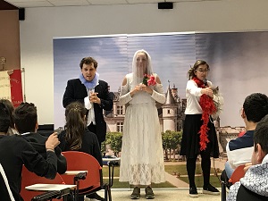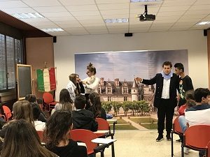 La rappresentazione si è tenuta nell’aula polifunzionale della scuola nella mattinata dell’8 aprile. Tre giovani attori madrelingua francese, della compagnia Lingue Senza Frontiere, hanno interagito con i ragazzi in uno spettacolo che ha messo alla prova le loro competenze linguistiche in francese ma li ha al contempo molto divertiti.
